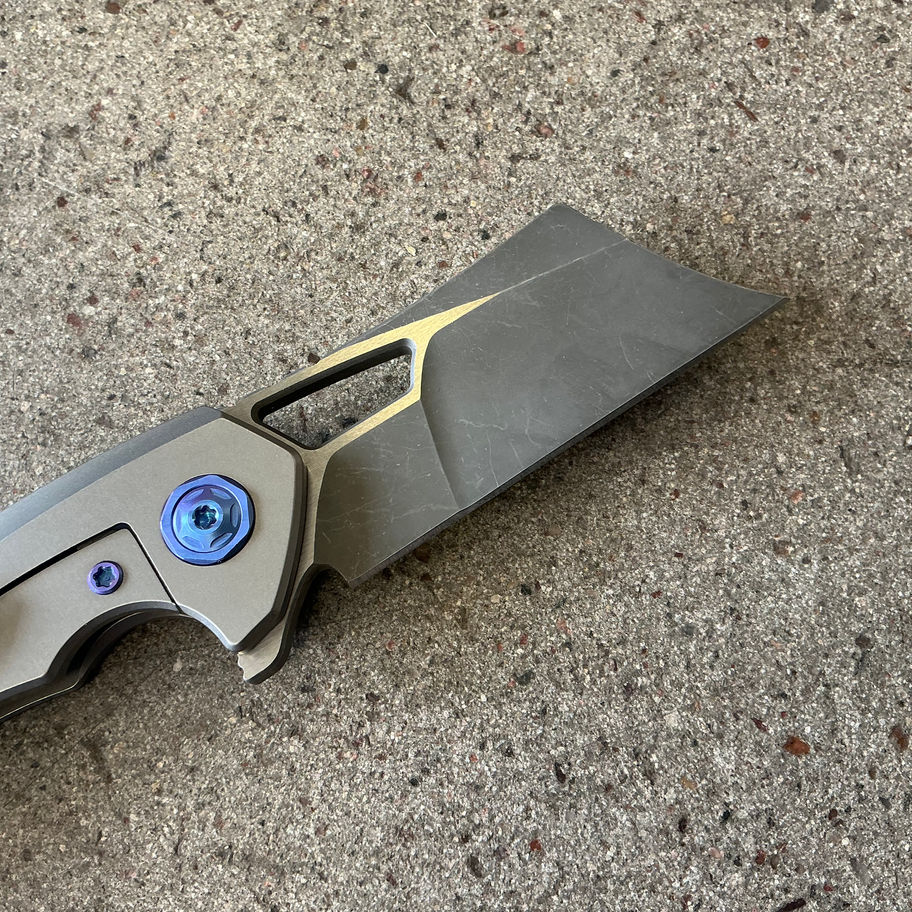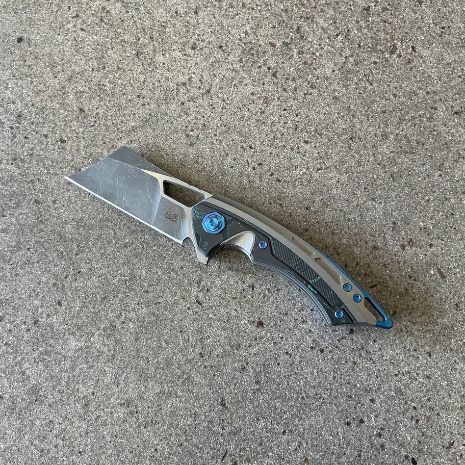 One of the coolest Cleaver style knives made. This flipper runs like no other due to the bearings inside the handles that the blade runs on. This features a flipper tab, and opening thumb hole. These knives feature grade 5 titanium scales and a mix of carbon fiber. Believe it or not they call this one the Mini Nautilus, despite having over 3 inches of cutting edge. Overall a superb knife.