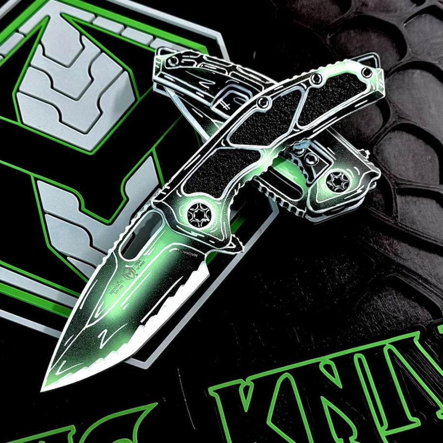 - Blade: Negative Cel Shade Toxic Green Cerakote finish, MagnaCut tanto blade.