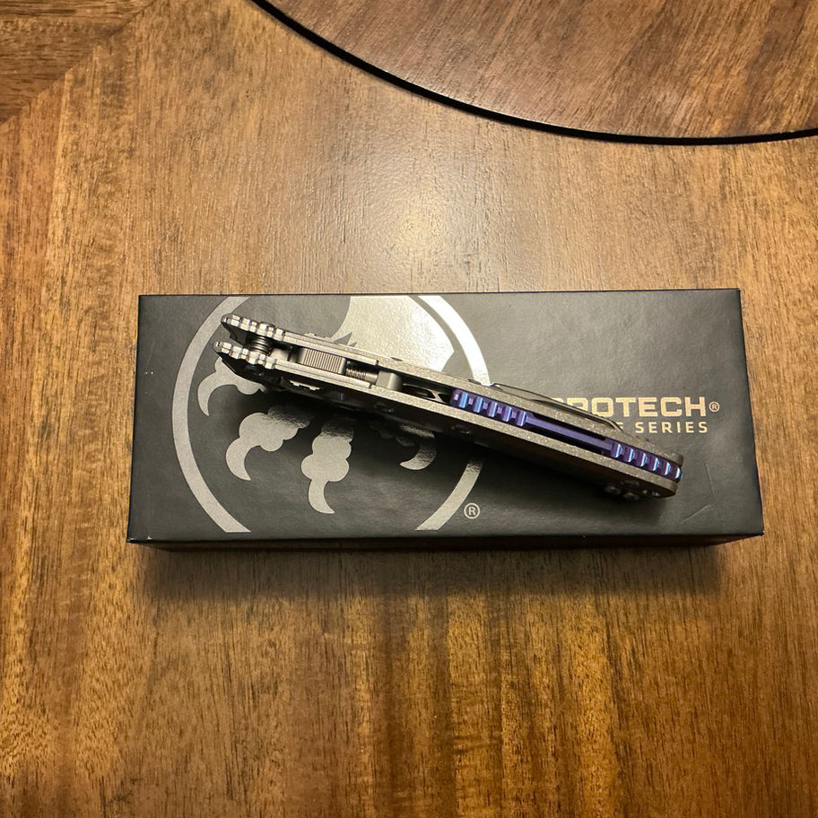 Microtech 137RL-10MS3 Marfione Select Amphibian RAM-LOK Manual Folding Knife 3.875" Bohler M390MK Stonewashed Clip Point Plain Blade and Slab Titanium Handles, Purple Titanium Accents, AXIS/Crossbar Lock